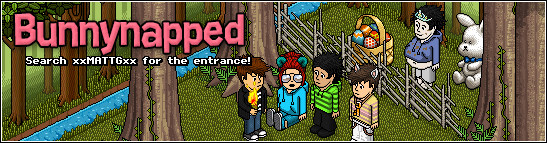 A ghost from the past has came back to haunt Habbox this Easter. The seldom seen Mathew has done something terrible. He's Bunnynapped the Easter Bunny and has gone around stealing Easter eggs from all of the boys and girls! The beloved Easter bunny tried to escape but he's no where near as tough as he used to be. The Events team have set out on a risky rescue mission but they feel they're missing something. That special spark that makes a team perfect. You! Mathew ran deep into the forest and could be far away by now so quick give chase! Take the proverbial blue pill and see just how deep this rabbit hole goes. We must save the Easter bunny and give those precious eggs back!