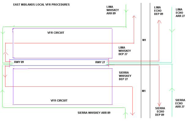Here is a diagram for the East Midlands entry and exit lanes. They must be followed on VATSIM while doing VFR Procedures.