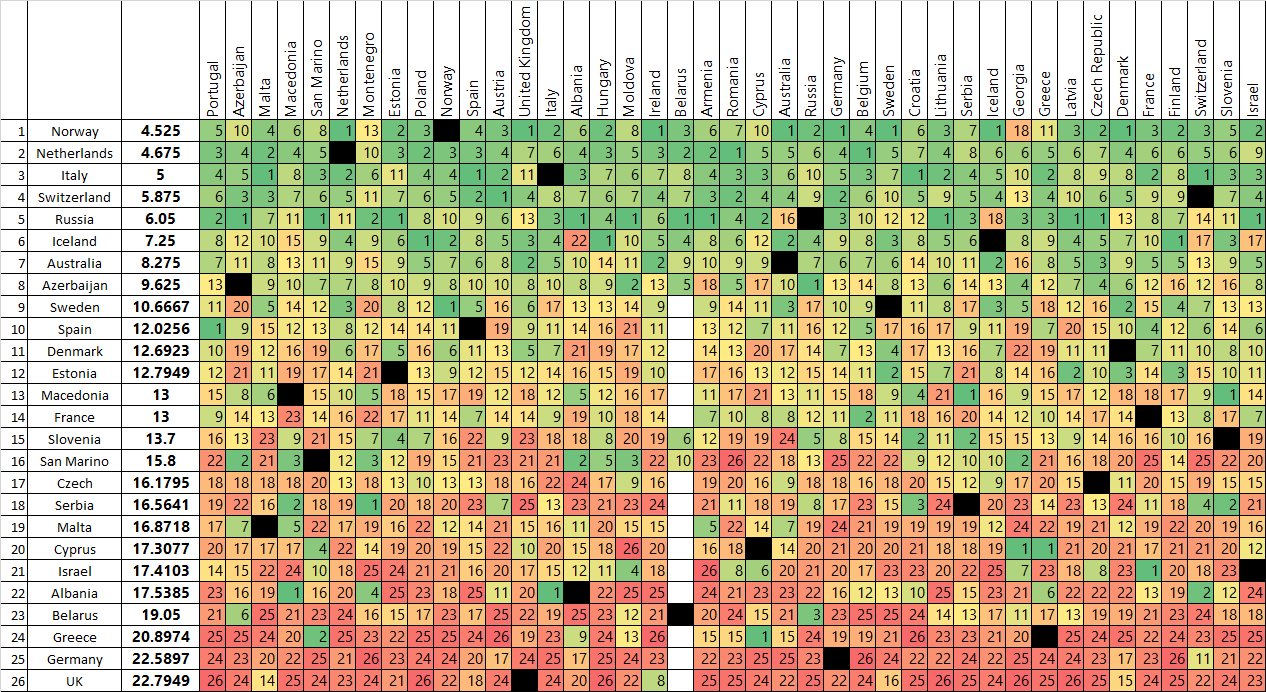 8 #1 spots for Norway and a massive 11 for Russia (wow), and yet the juries placed them 15th and 9th respectively. Largest EVER recorded disparity of votes between public and jury