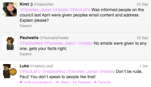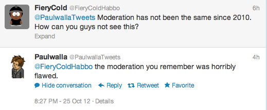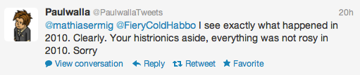 Why shouldn't he? As a company representative he should accept all opinions (leaving the people who throw abuses at him, obviously). I believe this guy named Mathias from Habbo.dk was blocked when he said that guardian system was not working and paul's reply was something like "your opinion not needed" I am not on my computer right now but I can find you numerous tweets in which he is either extremely rude or being foolish. I found a couple from an older thread on habbox
