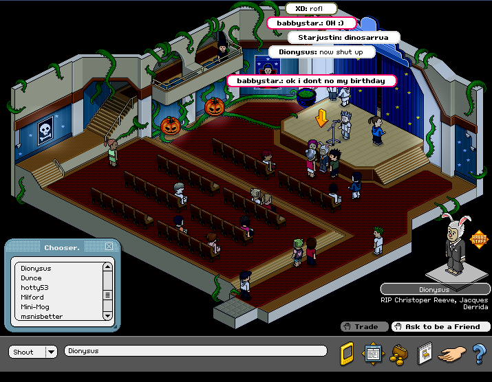 Well if you said dionysus was in the habbo gardens latrely not moving well i saw Jay in the habbo gardens about 30 mins not moving... WIERD