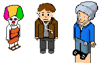 Me and my sister were on pur computer we had only just got one and it was amazing we found a pic of raster santa and were messing about with iti did the black girl not meen to be racist just saying she was black to start with.. and my sister did raster santa.. i made mine into a clown i thoguht wow imagine if that was me on habbo people would like look up to me! (in a newbie way) i then saw my first newbie fansite second fansite i had seen other was habbox obv lol and i realy wanted a job cause i thought it would be just like habbox and people would i was great... so a applyied for events.. (in the end i got manager :S lol) and i wanted more so i was looking i had no idea how to dj.. i was like back then eww writing i hate that for news reporter.. so i realised that what i did with girl to clown was pixel art so i sent that in... and they gave me job... they asked me to make a guy wearing an ipod for there radio...so i kept trying... twice and thoose are my 2 first etemps... i know i took the jacket from the habbox mini dress up game i was newbie.. ok =[ Lol