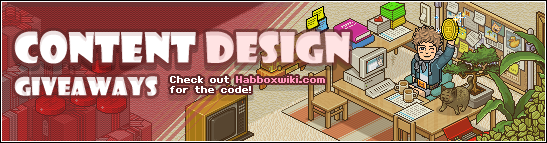 In an effort to improve wiki advertisement and to gain more readers, I came up with the idea of Giveaways! Similarly to HabboxLive, Content Design will host giveaways every now and then but with a twist. Instead of tuning into the radio for the code, you must visit www.Habboxwiki.com where the code will be displayed on the main page... supper jazzy, right?