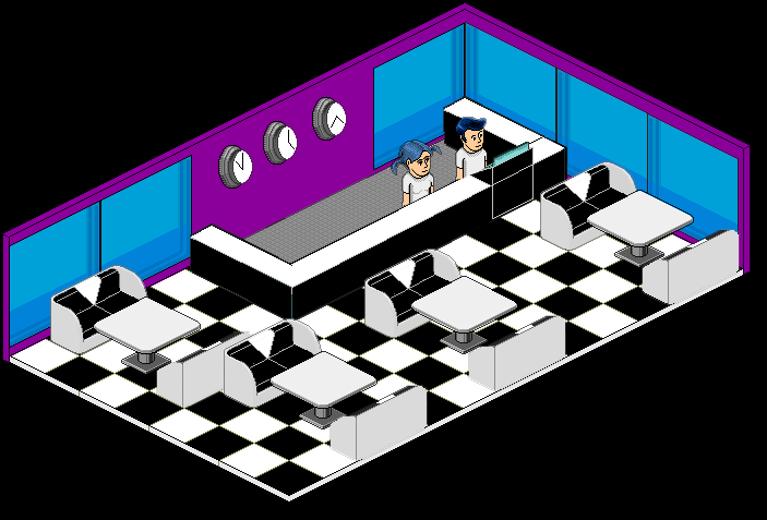 Very nice, but needs shading, quite a few pixel errors and i would pick another colour for floor if i was your, its hard to tell where the tables end and the floor begins and same with chairs... anyway good for a 2nd 8/10![]()