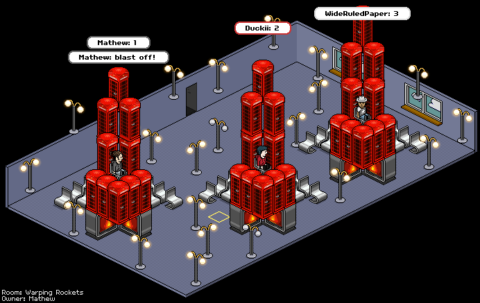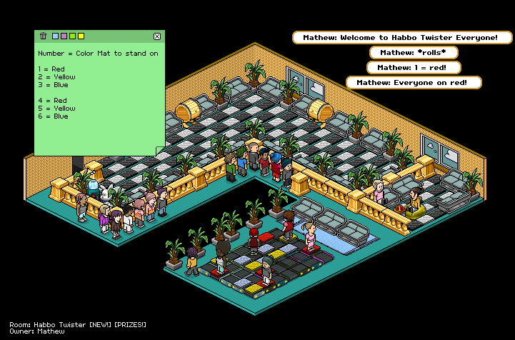 This was my entry for the "design a game" contest. It was called "Habbo Twister, the host basically rolls the dice and the players have to race to the corresponding color, last to get on that color is out. It ended up getting 2nd place