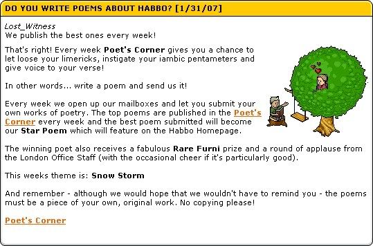 Poet's Corner Well While I was brousing the habbo homepage and well here it is!! Enjoy and Hope one of your poem's win's, there isn't much to write so here's a screenie!