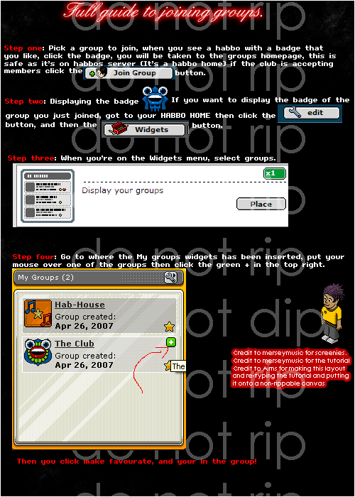 Step one : pick a group to join.. when you see a habbo with a badge you like click that badge... you will then be taken to that clubs homepage... this is a safe page as its on the habbo server (its a habbo home) If the club is accepting members then click thejoin group button.
