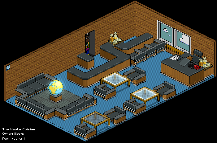 Nothing special, didn't have much left after buying all the bars etc. so the walls and most of the floor are pretty plain. I'm still waiting for the trees to go in the empty corners of the seating area. Haute Cuisine; based on part of a poem 'Nothing's Changed', the opposite is shown in my Working Man's Cafe room later in the list.