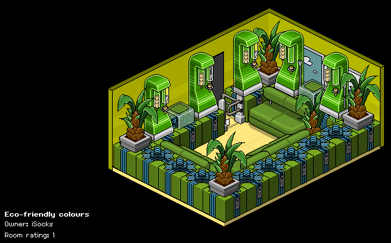 Quite a simple room, but i like it. I bought the ice cream machines when they were released thinking it would be a good investment but since they weren't worth much, thought to keep them and make a room around them. The walls are a bit bare but i'm planning on getting some brazil flags to go above the glass stools. Eco-Friendly Colours; green is related to eco-friendlyness.