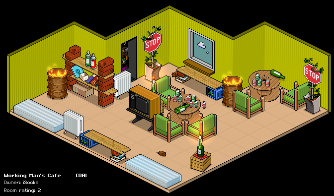 I already had a grunge room but it was very plain and boring, so i replaced it with the share bear room. I then tried to sell the grunge and just as i found a buyer, the new things came out so i kept it and created this room. Working Man's Cafe; the other type of eating place to my Haute Cuisine room from the poem 'Nothing's Changed'.
