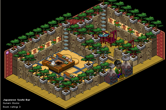 I already had a japan themed room, but when the new items came out i had to get them 'cos i loved the irori, i know the area with irori's look rather strange but it was the best i could do since they changed the stacking methods. Japanese Sushi Bar; sushi is japanese, the room is japanese based.