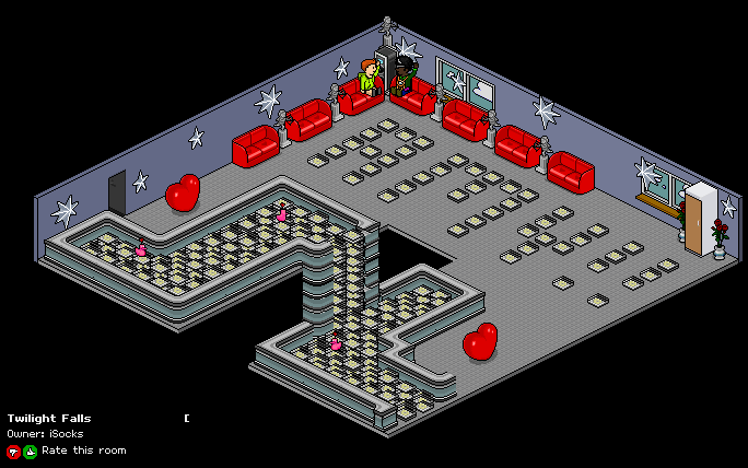 It isn't as good as i would have liked it, but i had reached the furni limit originally and have had to make some major adjustments to it. The end of the 'river' flows into the next room if you follow the teleport. Twilight Falls; no idea where it came from but its a waterfall and the stars make it look night time? Good enough excuse if you ask me.