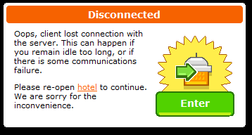 Lol, I got that after about 5 minutes of not doing anything, and then I got back on and took some screenies for some things and after that I left Habbo on (not purposely) and it stayed on for like over an hour and didn't disconnect me.![]()