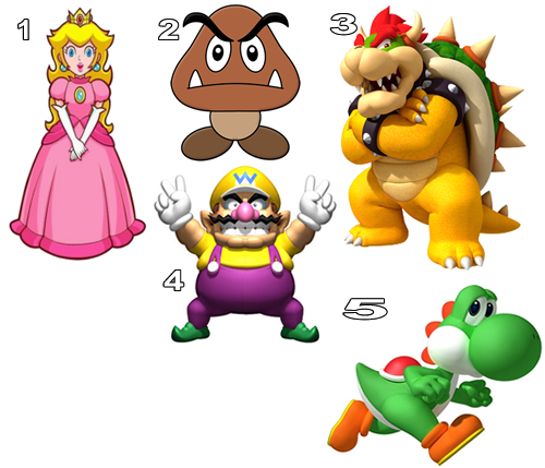 The retro game of Super Mario never gets too old, I love the game so much I still play it on many platforms! It is one of the only games where I think it has improved throughout the years instead of becoming too advanced like others. However, I bought a Super Mario Wii game and because I haven't played in a while I forgot all the character names and I need your help to remember them. Below are 5 characters from the various games they have created, I need you to PM HabboxComps with the name of each of them!