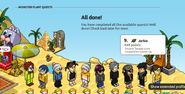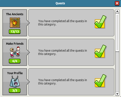 Now the quest is out - you cannot get max quest badge yet, but thats probs for the other stuff that will come out soon. The quests at the moment is really easy, you can get the start of the quest done super fast by visiting this room - http://www.habbo.com/room/58505975. - For the rest of it, you gotta search