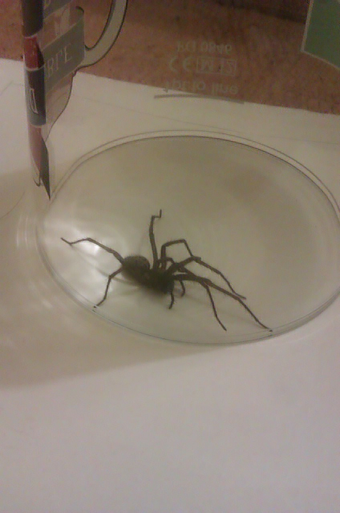 How do you deal with spiders? Do you condemn them all, or only the big ones? Do you catch them, or kill them on sight, or perhaps you leave them? I almost always use the glass and paper method. Last year I remember seeing something poking out from underneath the door. I thought it was a chunk of hair, so I brushed it with my bare foot and 'the hair' ran away. Turns out it was a humongous spider. I managed to catch that one, and another big one a couple of years ago. Here's a picture of the latter. It's in a pint glass.