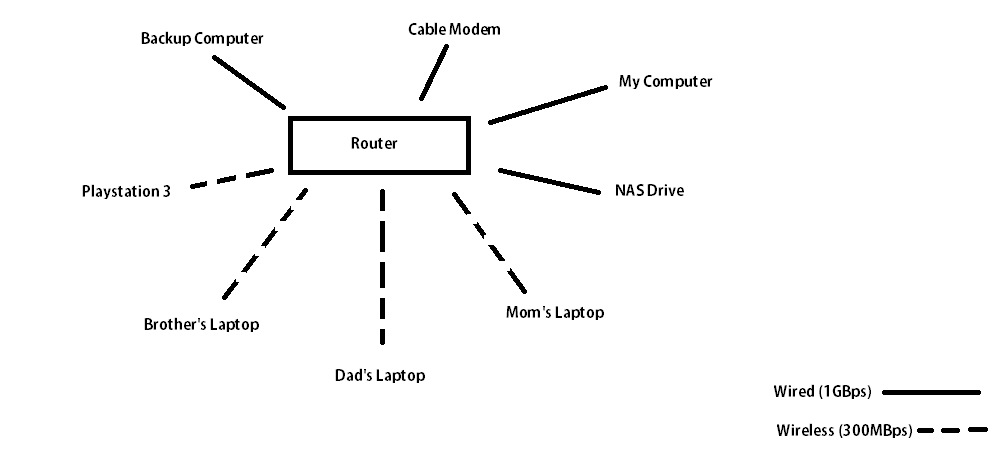Lines to and from wireless icons shows where the wireless is coming from and going to, the lines with out a wireless icon is an Ethernet cable. I'm not sure about the exact model of my dads computer or laptop, my laptop is black not gray and wider and my mums laptop is rubbish and XP so that is why there is a rubbish thing next to it.