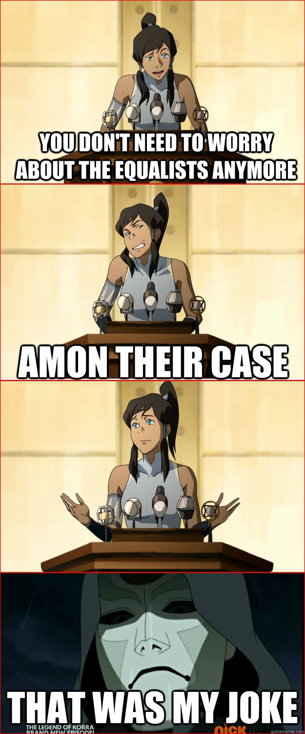 Firstly, why they no explain how Amon take bending. Ending was a bit of an ass-pull too, but I guess it is only a kids show after all. Still, that last scene with Tarrlok and Amon on the boat. Phew. Tarrlok is my hero. Someone erect a statue of Tarrlok. Also total freak out when it was Aang standing behind Korra and not Tenzin. Oh and Zuko never showed up. I'm dying here. All in all though, this series has nothing on the first. But Amon was a fantastic villain, wish the final fight was a but more epic. It's like they didn't even try to outdo Aang vs Ozai or even Zuko/Katara vs Azula, but I guess that is insanely hard to achieve.