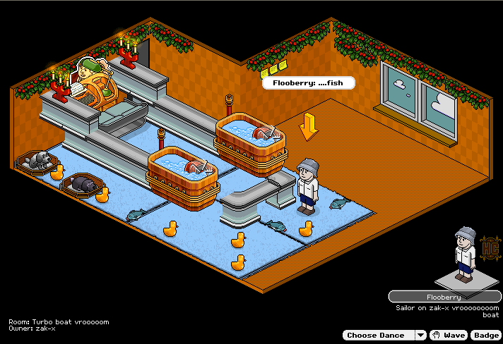 I really like the fans and tubmaster idea. I think you should rotate the ducks, and perhaps on the otherside of the room in the empty spot, perhaps a little island with plants, yellow rug etc...? Also, hollys don't really fit well with the whole theme. Overall, great originality! [9.5/10]![]()