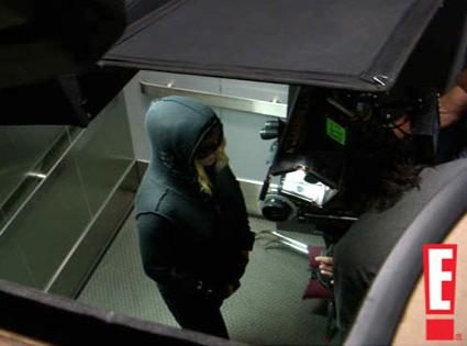 Britney, partially disguised by a gray hoodie, walks into the elevator. As she starts traveling upward, she seems particularly nervous and anxious. The popster starts pacing back and forth. Then she progresses to kicking and smacking the walls, all frantic-like. She screams into one of the cameras. Screaming, pulling her hair and banging her fists on the lift walls as it's stuck between floors. Then she starts climbing the wall, pulls down her hood and, into another camera, says: "It's Britney, b****."
