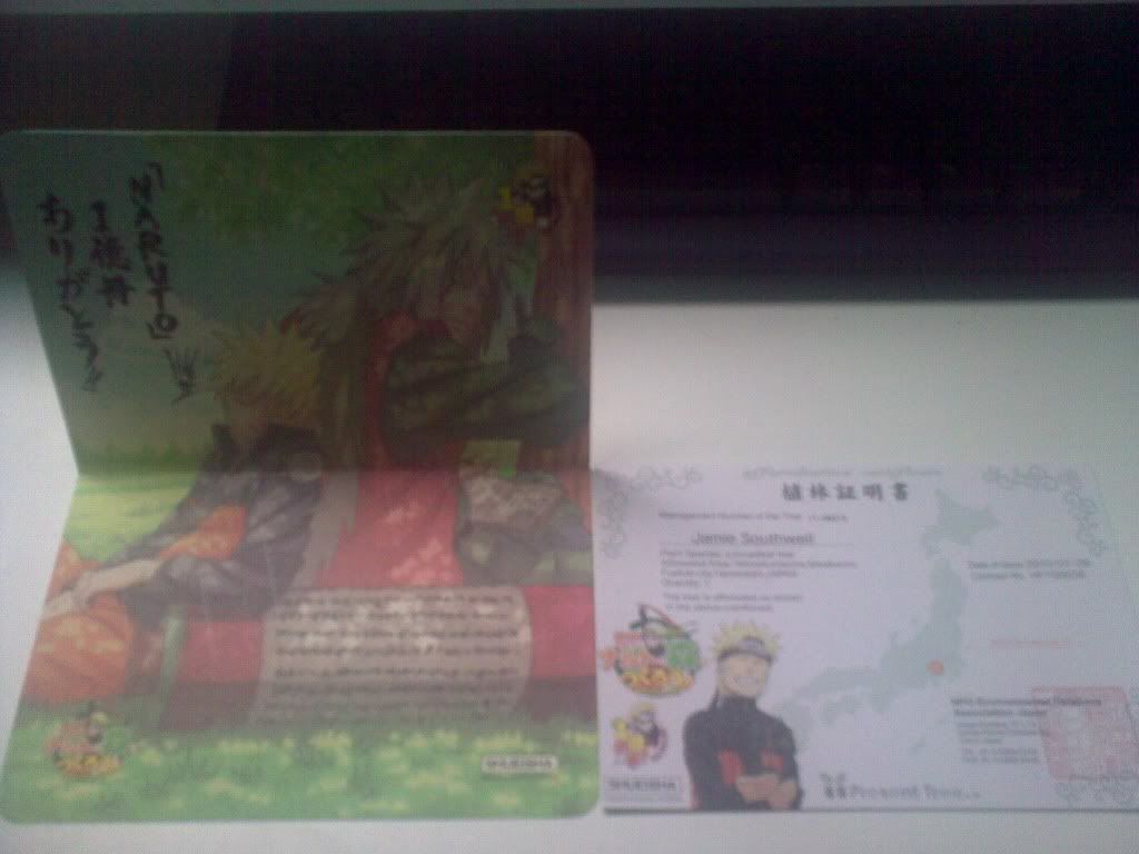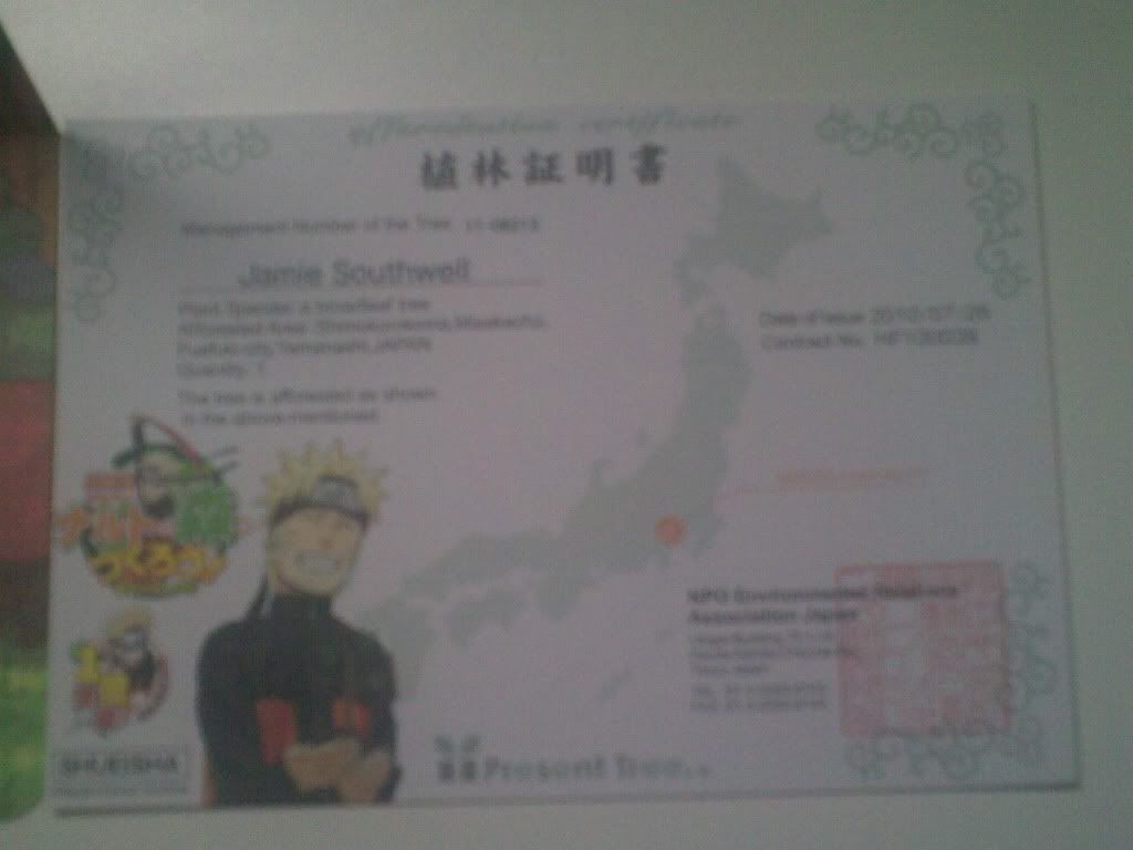 Basically put my name up for a thing they were doing for Naruto reaching 100 Million sales. Planting trees. Theres my certificate with name, the tree etc and my number so i'll be able to track it when they grow, 1 out of 7,610. No bad![]()