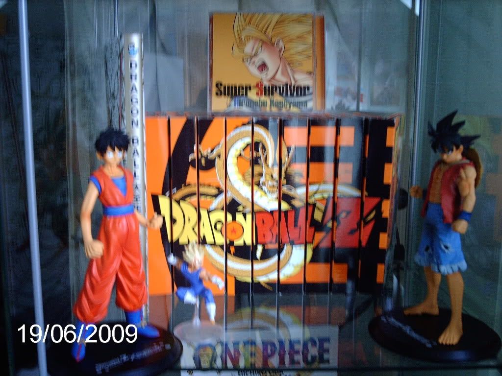 Top shelf of my display case, Dragonball themed. 9 season sets (Complete). With Super Survivor CD Single. Majin Vegeta Gashpon.
