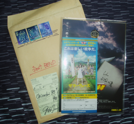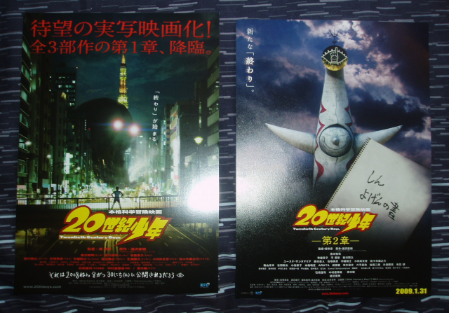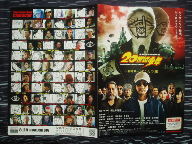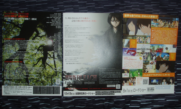 I got seven in total, which cost only £8. Free shipping even when it's from Japan, woohoo! Four 20th Century Boys ones, one for the first movie, one for the second movie, and two for the third. A Summer Wars one, an Evangelion 2.0 one and a Bleach: Fade to Black one. They're double sided, too.
