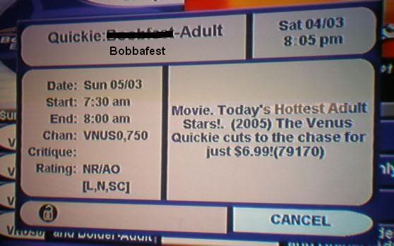 It's really gross how my mom watches a show called G-Spot on Showcase on Friday nights. We use to get all those chanels, but the satellite company sent out new cards and it doesen't have it on there =(