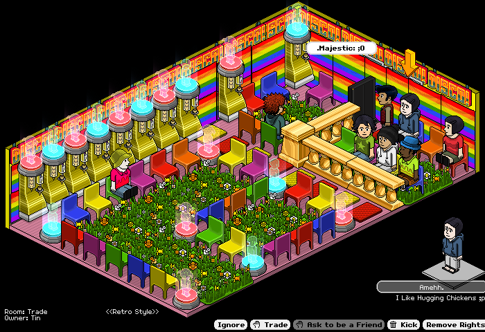 It certainly is colourful and bright and definitely a change from all those super rare filled trade rooms. I think there should be another chair to the left of the monolith. I know it'll block it but people can just sit on it and then go in.:p Secondly, I think there will be many blockers preventing people from entering half of the left side of the seating area so perhaps you could make a pathway through the middle. I dunno but there are some suggestions. This is a very cool room and reflects many bright colours to the Habbo public! Well done.[10/10]:d