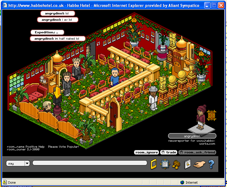 I was in DJ-3000's PH help desk room and angrydino1 came in and she sat next to me said hey, so I said hey back. She then asked me if I had a cam and msm, and I said no.. and she said I av and then she said "I'm half naked" LOL