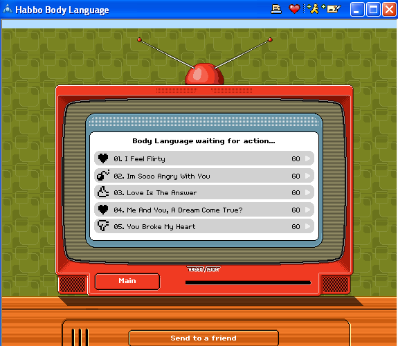Well i can't see it as been posted so i might aswell. A new bit has been added to the homepage called ''Say it with habbo'' click the habbo coming out of the box next to it.