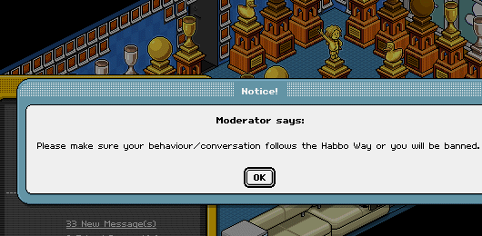 I don't play Habbo anymore and I came on to see my good friend Kate and I was wondering if I could ban myself for avoiding the filter. So I did it then reported myself saying I avoided the filter and I got 2 hour ban. Lolzzzz!