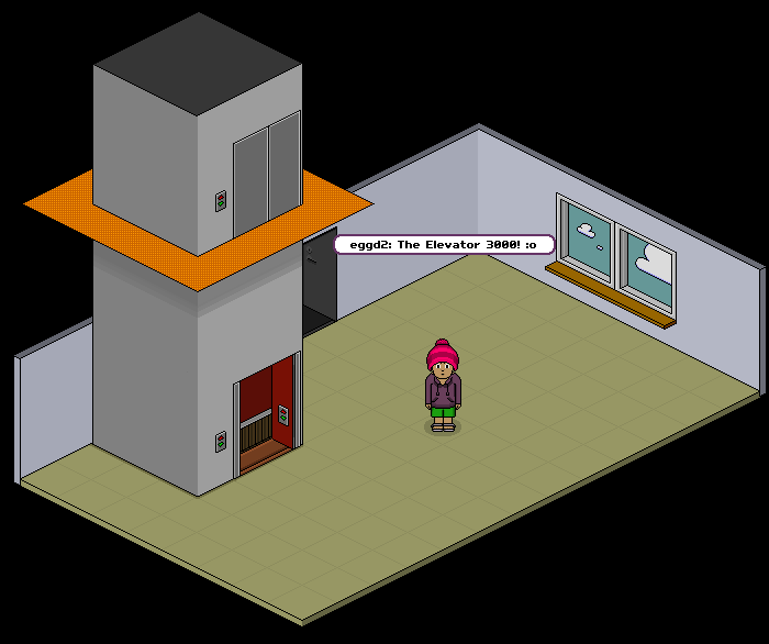 nice one i like it how you took my advice and put a door at the bottom but the back wall of the inside of the elevator looks like its right net to the door so u cuds only fit 1 habbo in it