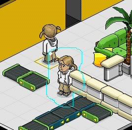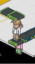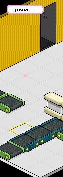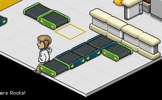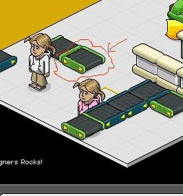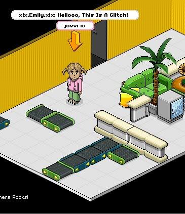While me and Emily were in the "Cool Foreginers Rocks" room, we found a VERY VERY funny glitch! What happened in this glitch was when we were on a roller (I moved it as I was making a maze thing with the furni) and Emily fell off the roller and INTO the blackness ! She was still in the room and talking, yet when you clicked her writing she had no arrow! The roller that was causing the problem was the one highlighted in red on the pictures ! Have a close look at some of these ! At first we were dressed the same, but I changed to the lighter colours so you could see the difference: