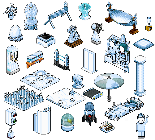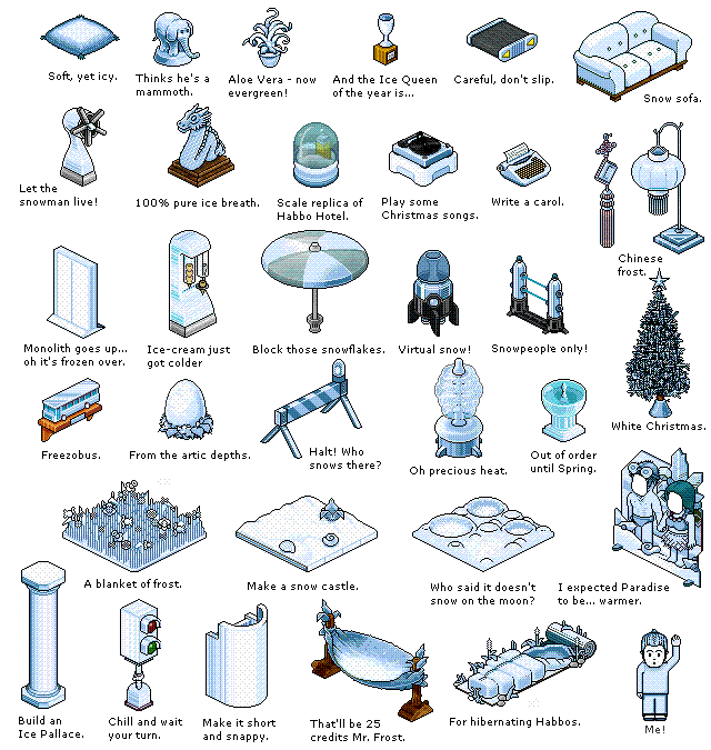 Here is a collection of Habbo rares I recoloured to make them look wintery. They are mainly supposed to look forst covered rather than snow covered but still I have kept some rules such as the base of a dragon or trophy is wooden etc.