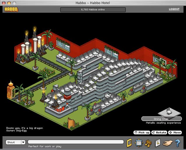 i liek the eyes! lol unlike others, i think it actually looked like a dragon i was thinking bout makeing a masive habbo lieing down or something then thought naaa to long WD +rep
