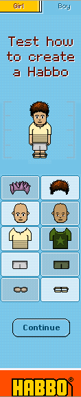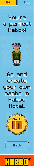 Isn't that false advertising? "Test how to create a Habbo." You don't create Habbos like that, the system is a lot different "/ They should of said "Create your own Habbo" or something, like the annoying advert on Mysapce about Zwinkies.