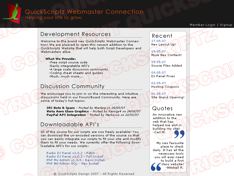 I am working on a new project of mine called the QuickScriptz Webmaster Connection. It will basically be like a giant webmaster resource centre where developers will be able to get help with integrating/modifying my sites scripts and etc. I made a Photoshop Mockup so let me know what you think.... personally not one of my best works but I was going for simple when I made it :S