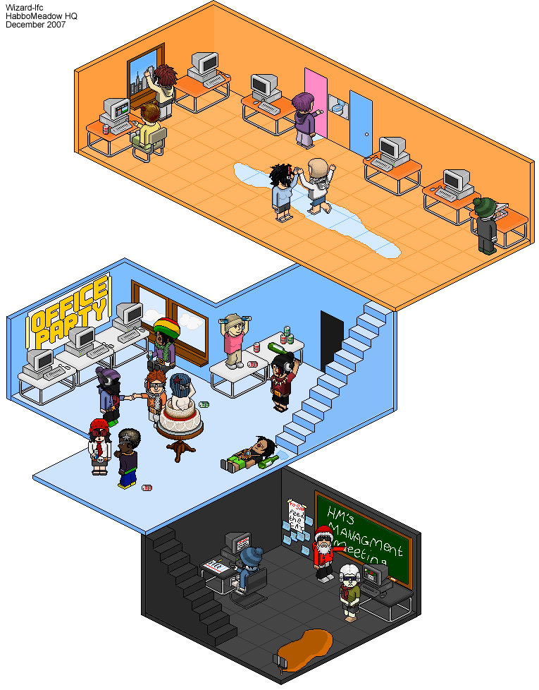 The top one looks a bit blank and empty. If you've ever seen Mit's Habbox Office, it looks busier and more interesting. The joins between the floor and the stairs looks dodgy on the top floor and the buried Habbo on the bottom floor needs more texture on the soil.