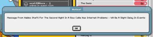 habbo staff have said, callie has had internet problems for the 2nd day. there will also be a deley in events.