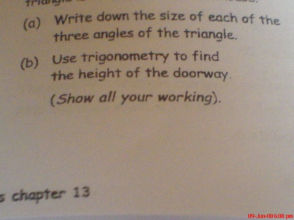 b) I'm assuming the triangle is the doorway. If you imagine there was a vertical line from the top of the triangle, to the mid point of the base of the triangle, you split it into 2 right angle triangles. You know the angle from part a, you know hypotenuse is 3m, and you are trying to find the height, which is the opposite, so from sohcahtoa it's going to sine that you need to use.
