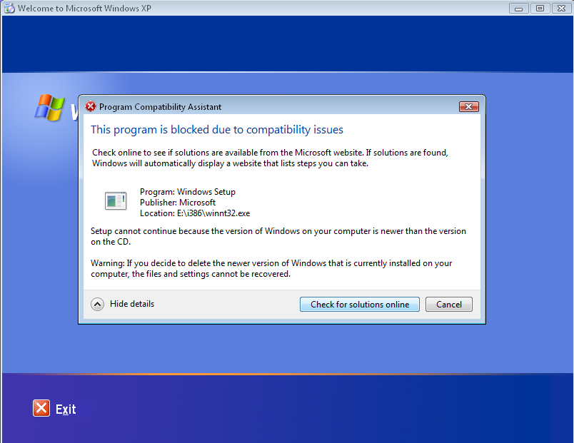 I put this disc in that I found in my old bedroom and I click install Windows XP but I get this error: