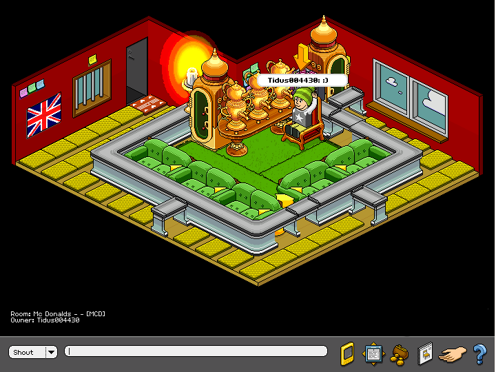The flooring and walls dont blend with the furni inside the room, it looks like burger king- add some more furni and experiment with the layout. 3/10