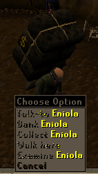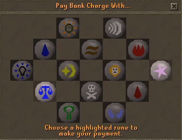 When you try to access the bank a screen like the one Below will pop up, you must choose what type of rune you would like to pay with to access the bank. If you use this method always carry about 5-20k fire runes in your inventory and use them to pay Eniola.