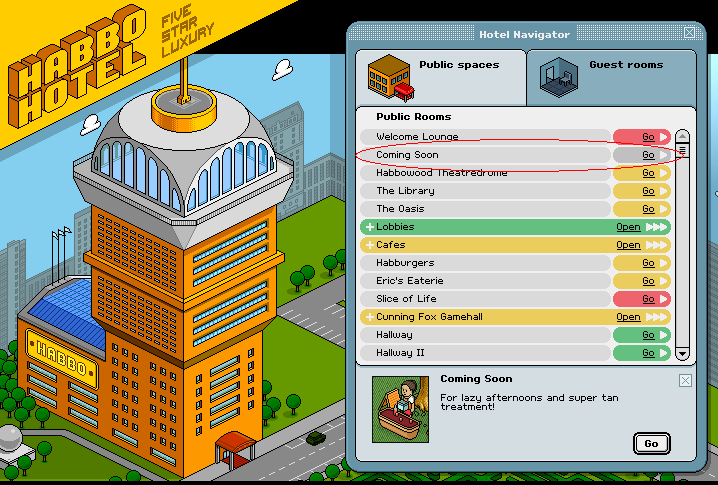 I spotted something different on the public room's part of the navigator, it seams that the "Picnic Area" has been moved to the "Outside Spaces: part of the navigator and its been replaced with a room called "Comming Soon", I couldn't get in but it says its empty? Is this new news or old news?