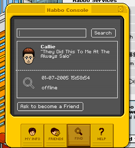 I was randomly browsing habbo when i searched Callie, To find that the Always salon gave her a Haircut so bad that it looks like she is joining some sort of army camp or something, Rofl![]()