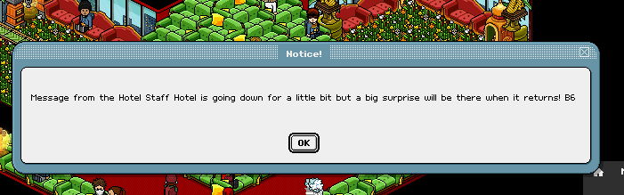 There was a hotel alert saying 'The hotel is going down for a little while but when its back there will be a BIG suprise!' B6'
