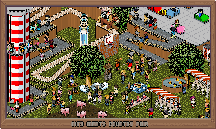 It was made by a user from habboing, she's not great on her pixel art, but the comments on any alt on their are very kind, they really don't like being a *****, well most of them. The rides are from the Habbo fair she decided to make a concoction of farm & themepark.