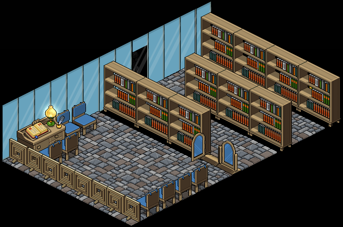 its nice in my opinion i say it can be improved by making the cobbled go under the bookcases as well and filling the empty wall with somthing maybe replacing the windows on the left and placing them on the right and where the windows was place them country wall poster things to give it that wooden effect in the room with a cobbled floor.