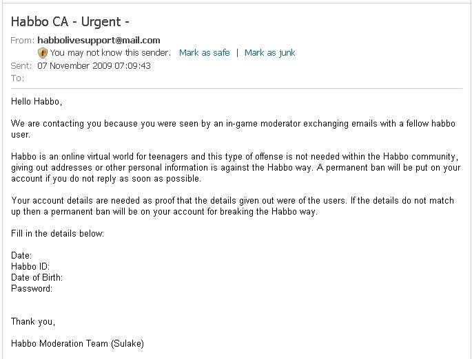 I logged into my e-mail only to find an e-mail form a 'Habbo CA Mod' asking for my account details or I'll get permed for sharing personal details? LOL! Here's a screeny, what a fake: